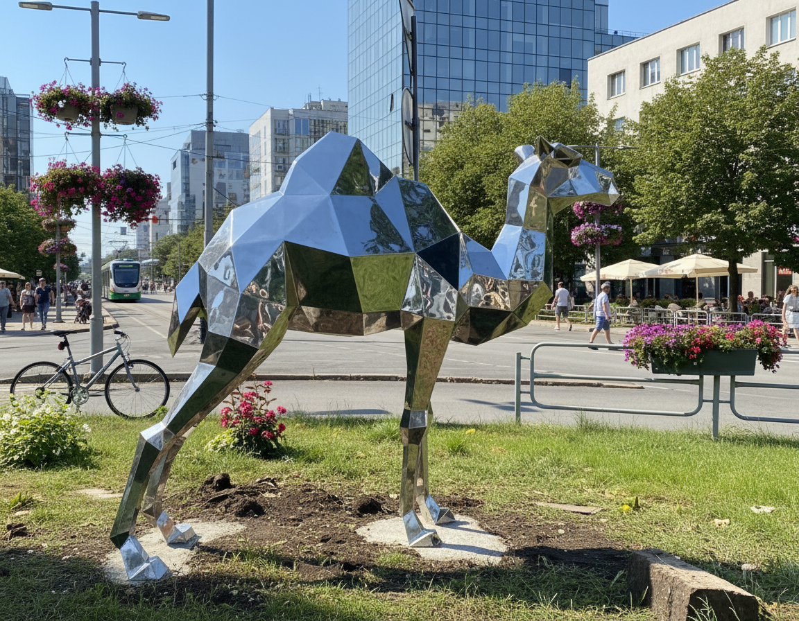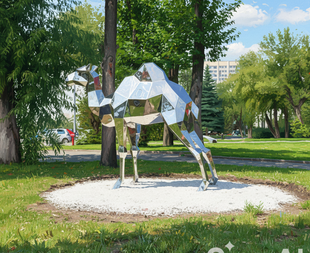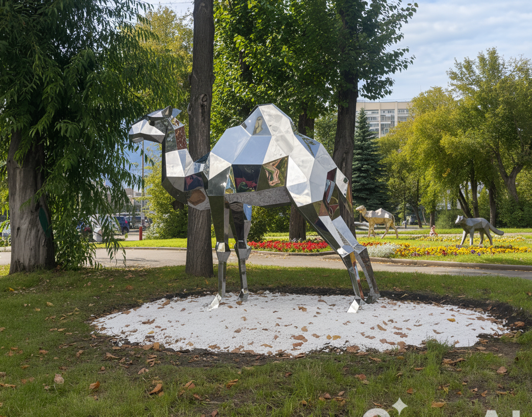 Полигональная фигура Верблюд может быть изготовлена в разных размерах, из разных видов стали, включая использование зеркальной нержавеющей стали. Прочные сварные швы обеспечивают устойчивость и долговечность, что позволяет устанавливать фигуру как в помещении, так и на улице.