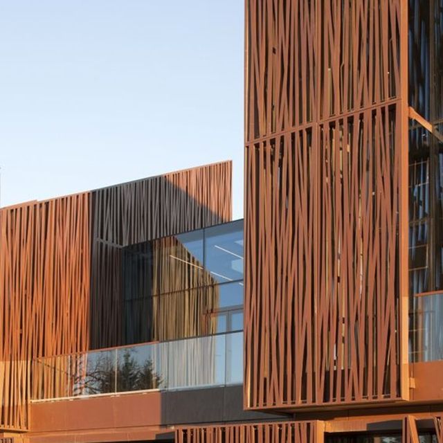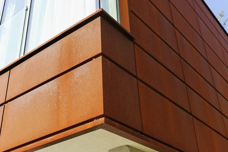 Важным аспектом при выбора варианта оформления фасада дома становится взаимодействие с окружающей средой – фасадные конструкции могут сочетаться с зелеными зонами, освещением и декоративными элементами. Металл, обработанный под естественное старение, придает зданию фактурность и индивидуальность.