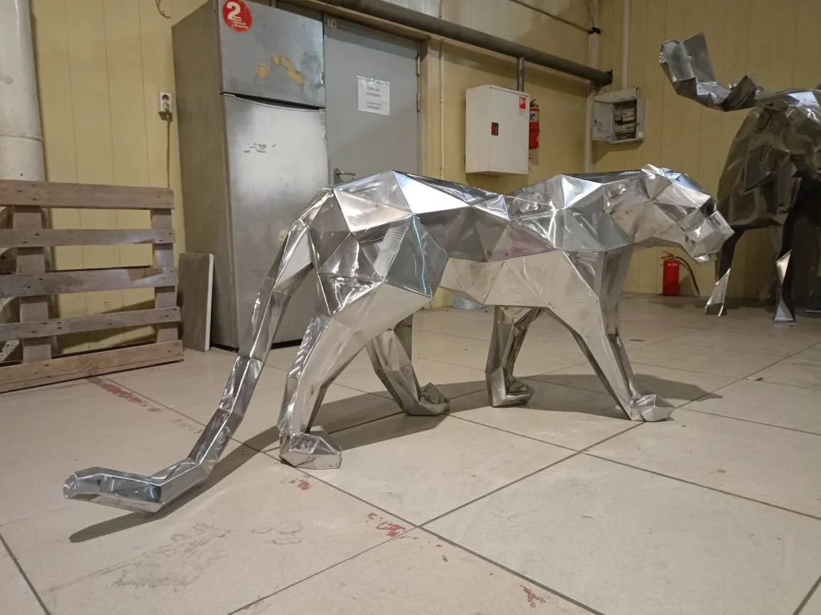 Представьте себе: вы прогуливаетесь по парку, и вдруг ваше внимание привлекает изящная фигура пантеры, словно сотканная из множества геометрических граней. Это не просто скульптура, это современное произведение искусства, которое органично вписывается в окружающую среду и притягивает взгляды.